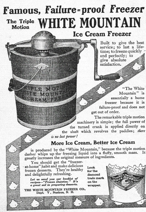 I got the recipe from her and when I got married I lobbied hard to take some of our wedding-gift-cash and buy our own White Mountain freezer with it. We had to order one from a hardware store – at that time, the manufacturer was still a little independent company in New England and the things were still made much as they had been for the previous hundred years. Wait, I just looked it up – since 1872, according to our friends at Wiki. Or 1853 if we are to believe Sunbeam, the current owner of the company. They were not cheap, but what is when it’s made to last?