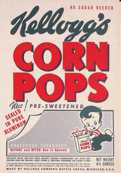 1955 Packaging for Kellogg’s Sugar Corn Pops – from a Pinterest page on vintage advertising
