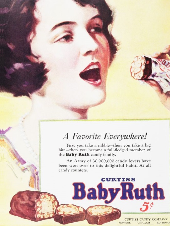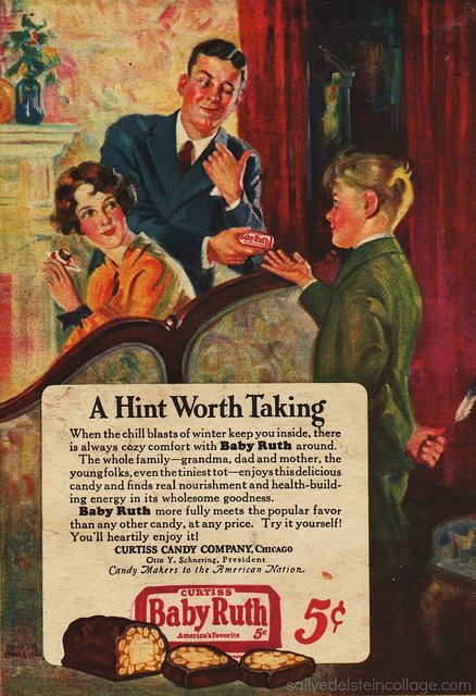There were a lot of fascinating tidbits in here about Baby Ruth bars JP. As I was not allowed to indulge in candy, except on holidays, when I was growing up, I had to find out about Baby Ruth bars in my teens. I remember getting them confused with Snickers, or even Payday (but the latter has mostly nuts and caramel). The third photo down, the ad “Sweetest Story Every Sold!” had me salivating as I read the description of the ingredients!