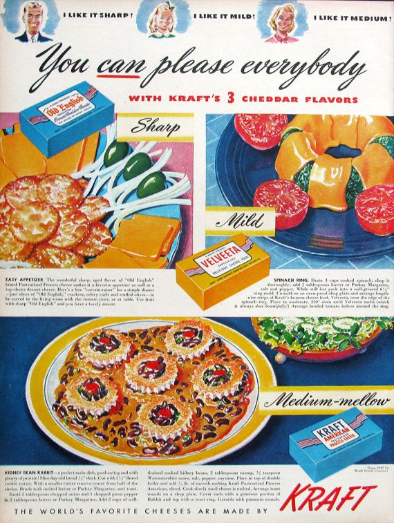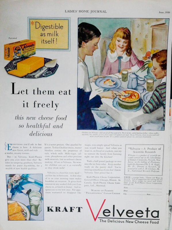 As I think about it, for the people in charge of household food in the 1930s and 1940s, something like Velveeta must have seemed like a miracle. If you were not in the general vicinity of big dairy operations that specialized in real cheese, the real stuff was probably hard to get, expensive, and with not a great shelf life. Something like Velveeta was readily available, would last a long time, and could get the job done when it had to.