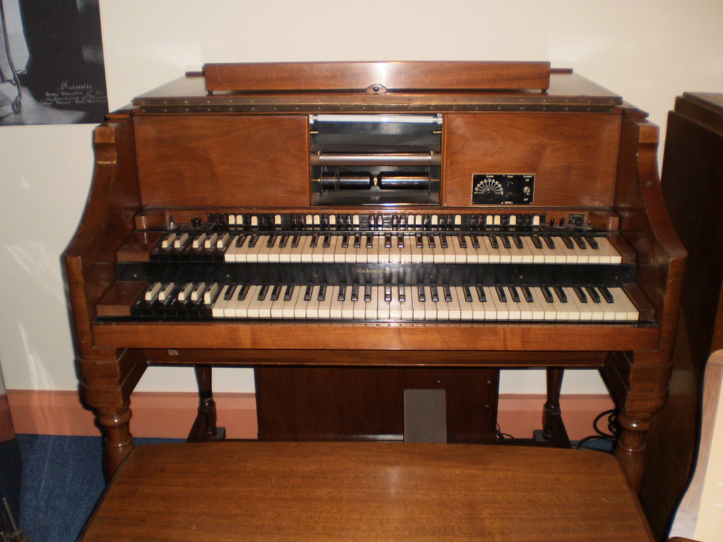 Laurens Hammond was a mechanical engineer and all-around tinkerer. He started the Hammond Clock Company in the late 1920’s and was even building a bridge table of his invention that included a built-in automatic card shuffler. He had noticed the sounds made by the whirring works of his electric clocks and started fiddling with the idea of a musical instrument that worked on the same principles. His organ employed “tonewheels”, or ridged discs spun by an electric motor, each of which generated a specific sound frequency. Those frequencies were electrified by a coil and amplified through a speaker. Hammond was not a musician and required help to tune the tonewheels to musical notes. With that task completed, Hammond patented and began selling his electric organ in 1935.