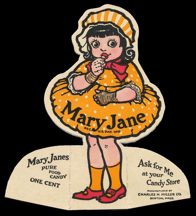 Also unclear is the source of the candy’s name. Miller claimed that Mary Janes were named after his aunt. However, it is undeniable that the candy came out during the peak years of R. F. Outcault’s Buster Brown comic strip, in which the principal female character was – you guessed it – Mary Jane. Well, actually it was “Mary-Jane”. The comic and that character clearly inspired the famous little girls’ shoe style of the same name, and most likely served as the inspiration for this candy brand too.