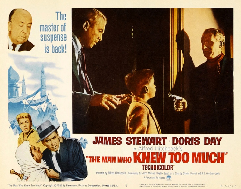 The Man Who Knew Too Much (1956). This is the only remake of this crop, with the original having been done by Hitch in 1934. This time, James Stewart is an American doctor who is vacationing with his wife (Doris Day) and young son in Marrakesh. Stewart’s character sees something he should not have seen and the bad guys kidnap his son to keep him from spilling the beans.