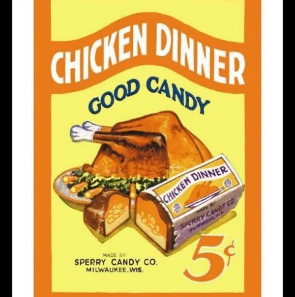 The granddaddy of this genre was the Chicken Dinner.  That one came from the Sperry Candy Co. of Milwaukee, Wisconsin in 1923.  Nobody seems to know how the chocolate-covered nut roll with the roasted chicken on the wrapper it got its name, but those same sources are pretty sure this product was the inspiration for the old phrase “Winner, winner Chicken Dinner!” However it got the name, it remained a steady seller until Sperry was bought by Pearson’s in 1962. Unfortunately for that confection’s fans, that sale cooked Chicken Dinner’s goose and the candy bar was no more.
