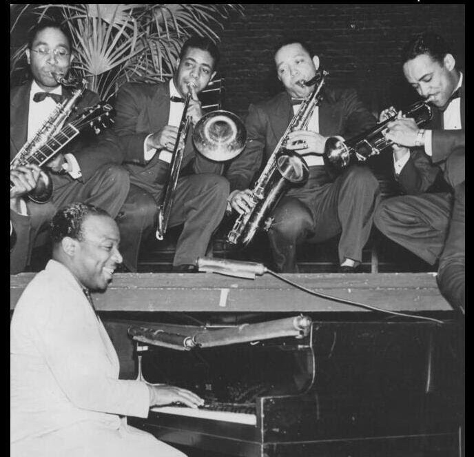 Basie was playing with a burlesque show that went bust in Kansas City, and it was there that he developed his musical style as he made his living in that wide open, everything-is-legal town. This led to gigs with Walter Page’s Blue Devils in 1928 and the better-known Bennie Moten band in 1929. When Moten died in 1935, Basie tried to keep that band together but could not. But out of its ashes came a 9-man group called The Barons of Rhythm. When a radio announcer thought Basie’s name needed some pizzaz, he became Count Basie.