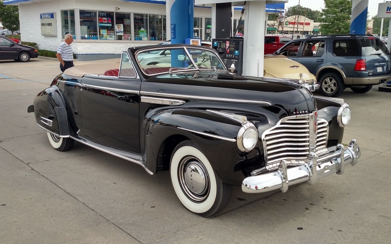 The black car is a 1941 Buick Super. In its last full year before car production ceased for WWII. In 1941, Buick had a smashingly successful year. This Super is the middle level of the lineup, above the price-leading Special and under the top dog, the Roadmaster.