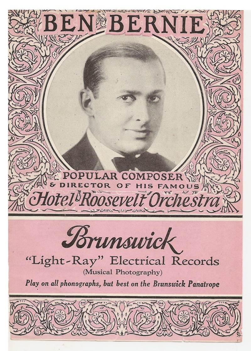 Did you know that there were genuine sound movie shorts as early as 1925? I didn’t either, but we have one here. That year Bernie and his band were captured on an experimental PhonoFilm, a short-lived format pioneered by Lee DeForest, inventor of the vacuum tube . This film, with an electrically/optically recorded sound track, has better sound than the original record, which can be heard here, and it is also a more spirited performance. It is fun to watch the boys get into the rhythm of jazz from before the swing era – something we can only imagine by listening to the record.