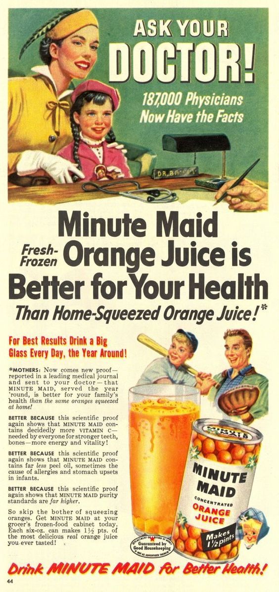 Like in this early television commercial from 1954. From the beginning, the pitch was that Minute Maid was “better for your health”, with more vitamins and minerals and with fewer impurities than in “fresh squeezed”. Competitors like Bird’s Eye and Snow Crop soon jumped in and cans of frozen orange juice concentrate were in home freezers from coast to coast. The company became so big that Coca-Cola bought it in 1960.