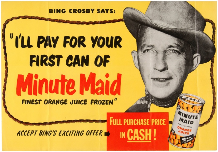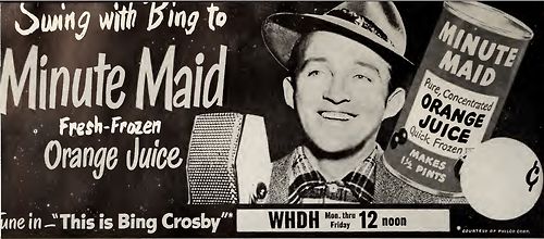 I also remember Bing Crosby doing Minute Maid ads in the 70s, and had no idea at the time that he had been hawking the stuff for its entire existence.